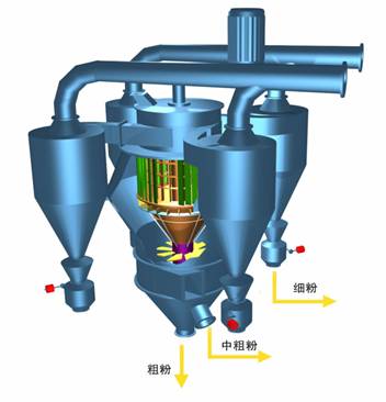高細轉(zhuǎn)子式選粉機(人工制砂專用)是黎明重工經(jīng)多年研究開發(fā)的外部循環(huán)式帶轉(zhuǎn)子的改進型選粉機,它是在轉(zhuǎn)子式選粉機的基礎(chǔ)上,將平面渦流理論運用在旋風(fēng)式選粉機設(shè)計而成。經(jīng)實踐使用證明,選粉效率達85%以上,而且細度調(diào)節(jié)方便、靈活、性能可靠。